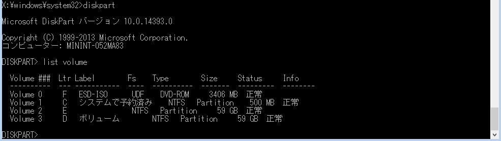diskpart → list volume でボリュームの構成を調べます。この環境では E ドライブがWindows に割り当てられています。
